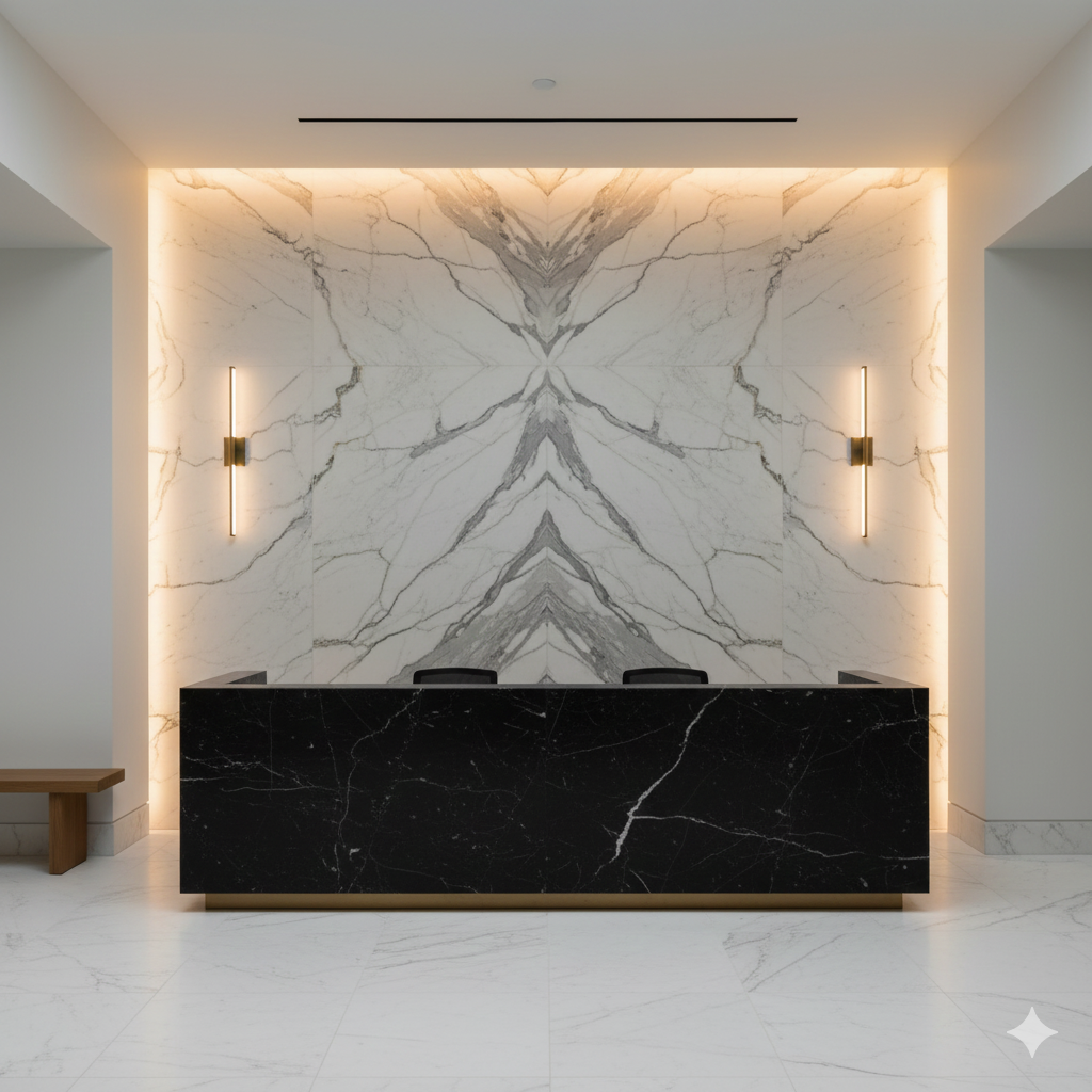 Plan veins like a graphic system. Book matched walls create a centred image for reception photos. Vein matched floors in long corridors guide movement and make circulation feel intentional. Approve a vein layout before cutting so every joint supports the story.
